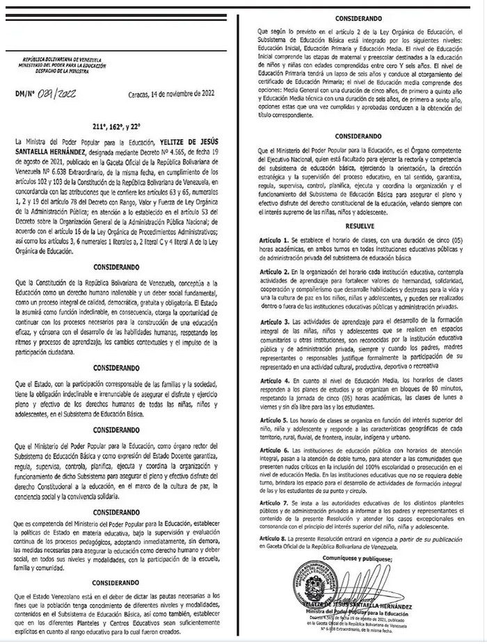 De acuerdo a la Gaceta Oficial número 42.505 del martes 15 de noviembre, el Ministerio de Educación, estableció nuevos horarios de clase en todas las instituciones educativas públicas y privadas del país.