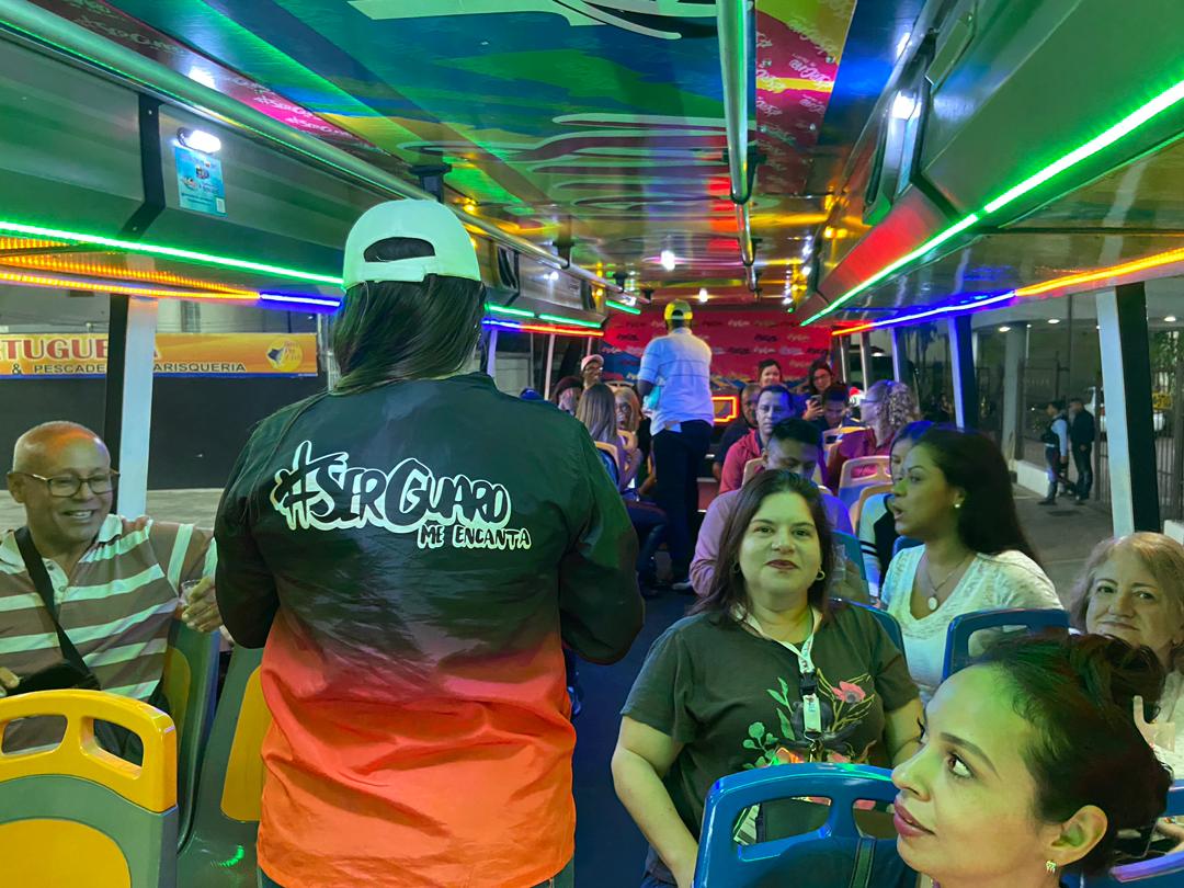 A bordo del Guaro Tour, 30 turistas venezolanos y de otros países de visita en Barquisimeto por la Feria Internacional de Turismo FITVEN 2023, disfrutaron las atracciones turísticas de la ciudad bajo el cielo nocturno, como parte de los servicios turísticos ofrecidos por la Alcaldía en el marco de este importante evento.