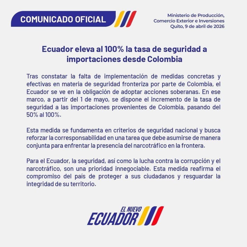Ecuador aumentará del 50% al 100% los aranceles a las importaciones de Colombia como respuesta a las actividades de los grupos criminales que operan en la zona fronteriza y se dedican al narcotráfico, informó el Ministerio de Producción, Comercio Exterior e Inversiones ecuatoriano.