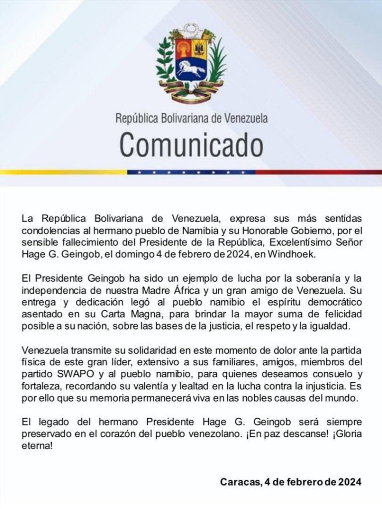 La República Bolivariana de Venezuela, expresó sus sentidas condolencias al hermano pueblo de Namibia y su Honorable Gobierno, por el sensible fallecimiento del presidente, Excelentísimo Señor Hage G. Geingob, este domingo 4 de febrero de 2024, en Windhoek.
