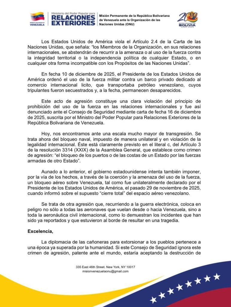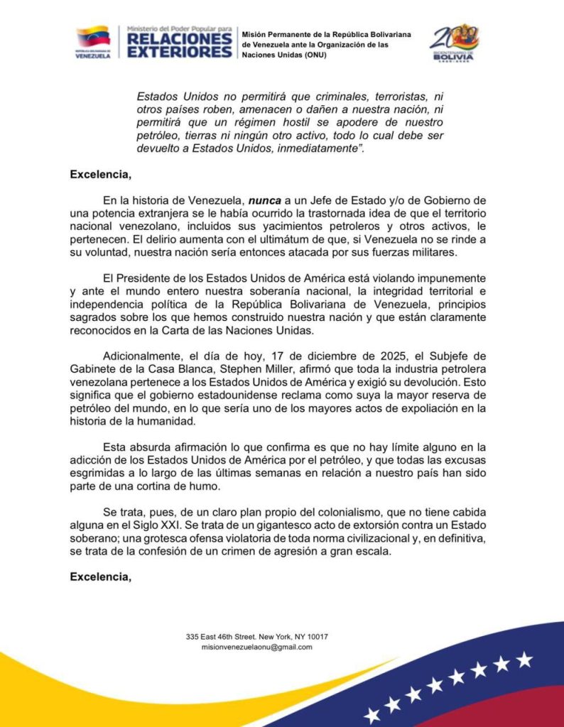 En un comunicado firmado por el embajador permanente de Venezuela ante la ONU, Samuel Moncada, se indica que «estas acciones violan flagrantemente la Carta de las Naciones Unidas, constituyen un crimen de agresión, y buscan someter por la fuerza a una nación soberana que jamás se rendirá».